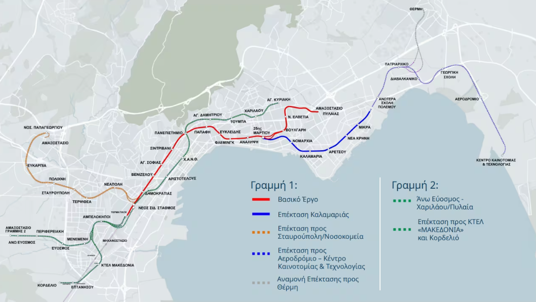 Na de grote stadsbrand van 1917 stelde premier Venizelos een commissie in die met voorstellen voor de wederopbouw van Thessaloniki moest komen. Onderdeel van het wederopbouwplan uit 1918 was de aanleg van een metro, die binnen de stadsmuren in een tunnel onder de Egnatialaan zou lopen en ten oosten van de universiteit bovengronds. De stad werd herbouwd zonder metro en in 1968 kwam er een nieuw voorstel voor een metro, dit keer als ringlijn, dat evenmin werd uitgevoerd.