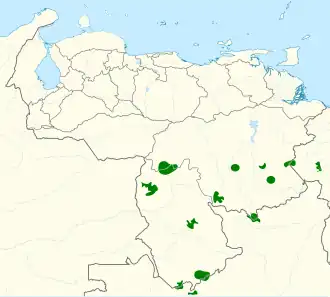 De vogel komt voor in verspreid liggende heuvellanden van zuidoostelijk Venezuela, Guyana en Suriname op hoogten tussen 1000 en 2000 meter boven zeeniveau.[3]
