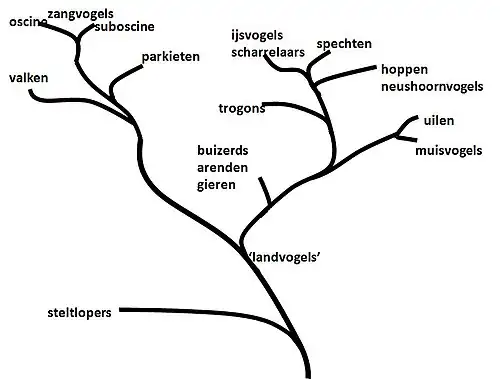 In het DNA-onderzoek naar de taxonomie van de vogels van Hackett et al. kwamen de papegaaiachtigen verrassend als de naaste verwanten van de zangvogels uit de bus, daarin gevolgd door de valken (maar niet de andere roofvogels). - Volgens modern moleculair genetisch onderzoek aan de papegaaiachtigen zijn de drie hoofdgroepen volgens dit zogenaamde cladogram met elkaar verbonden:[3]