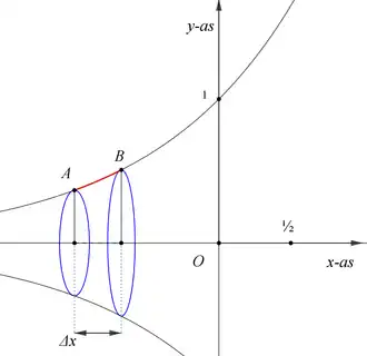 Wordt het deel van de grafiek van de functie dat links van de -as ligt, om de -as gewenteld, dan kan de oppervlakte van de mantel van het omwentelingslichaam worden uitgedrukt in , zoals in de figuur is aangegeven. Bij benadering is voor het deel van de mantel tussen de punten en voor kleine :