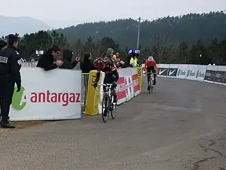 Alejandro Valverde voor Samuel Sánchez bij de aankomst van de vierde etappe in Mende