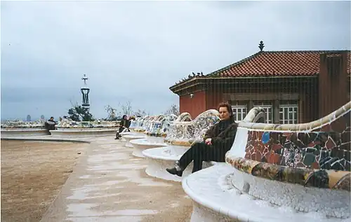 Park Güell is een uitgestrekt stadspark in Barcelona, in het Spaanse landsdeel Catalonië. Het is gelegen in het stadsdeel Gràcia in het noordoosten met een oppervlakte van 15 ha met dichte dennenbossen, lanen met palmen en een door bomen omzoomd plein. Een bonte bank (een reuzenslang) kronkelt door het park (het aards paradijs) als rendez-vousplaats (de appel).