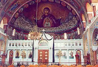 Het interieur omvat de fresco's van de koepel (die met hun bijzonder originele kleurenpalet een harmonieus samengaan vertegenwoordigen van eerbied voor traditionele vormen en zoeken naar vernieuwing), van de apsis (de Moeder Gods "Platytera", voorgesteld als beschermster van de stad Patras) en een fraai gebeeldhouwde houten kroonluchter. Behalve het gouden schrijn met de schedel van de apostel, ziet men hier ook het reliquarium van het kruis van Andreas. Dit werd vanaf de 13e eeuw vereerd te Marseille, in de kerk Saint Victor, maar in 1980 eveneens teruggeschonken aan de stad.
