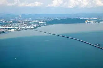 Het eiland wordt door twee bruggen met het vasteland verbonden: de Penang-brug (1985) en de Sultan Abdul Halim Muadzam Shah-brug (2014). Op het smalste punt, bij George Town, is het water 4 km breed.
