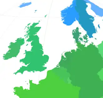 Scheve perspectiefprojectie van Nederland en omgeving (staatkundige kaart) vanuit een lage baan (700 km)Perspectiefprojectie van de Noordpool en omgeving (staatkundige kaart) vanuit een hoge baan (35.786 km)