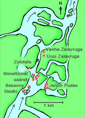 De rotstekeningenvelden bevinden zich op eilanden van de rivier de Vyg, in de buurt van de waterkrachtcentrale van Vygostrov en op 6 km van de Witte Zee. De rotstekeningen zijn verdeeld over verschillende velden waaronder Staraja Zalavruga (meer dan 200 petrogliefen), Novaja Zalavruga (1.176 tekeningen), Jerpin Pudas (157 tekeningen), het noorden van Besovy Sledki (470 tekeningen), het zuiden van Besovy Sledki (60 tekeningen) en Zolotets (19 tekeningen).