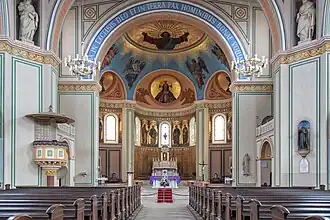 In de triomfboog staat de tekst gloria in excelsis deo et in terra pax hominibus bonae voluntatis. Het koor is beschilderd met boven een afbeelding van God de Vader als Schepper der Wereld omgeven met de regenboog en een stralenkrans. In de middelste apsis is de Zoon van God de vier apocalyptische dieren afgebeeld met in Zijn hand een boek met de tekst ego sum via veritas et vita. De Drievuldigheid wordt gecompleteerd met het venster dat een duif uitbeelt, het symbool van de Heilige Geest. In de zijapsissen zijn muurschilderingen van Maria en Jozef. Tussen de vensters bevinden zich muurschilderingen van evangelisten, kerkvaders en heiligen tussen palmbomen.