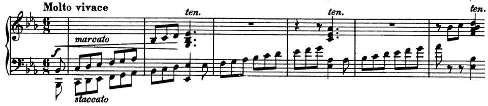 Het eerste deel is een fris en snel gedeelte (allegro betekent snel in het Italiaans), dat start met enkele krachtige akkoorden.