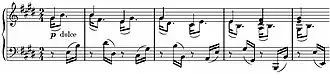 • Het eerste thema is een murmelend 'dolce'-thema, lieflijk, in 2/4 maat met een wiegende zestiendeninvulling in de begeleiding. De luisteraar heeft niet direct door welke melodienoten op de 1e tel van de maat vallen, de maat is dan ook een duidelijk ondergeschikt element;