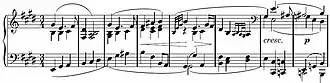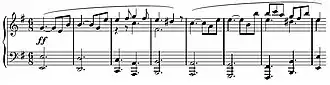 • Het andere thema is een 'adagio espressivo' thema, dat gepassioneerd werkt, beginnend met een verminderd septimeakkoord dat als arpeggio naar forte opstijgt, daarna gevolgd wordt door voorzichtige zestienden, in 3/4 maat. Dit tweede thema herbergt in zijn ontwikkeling enige krachtige pianistische effecten en contrasten.