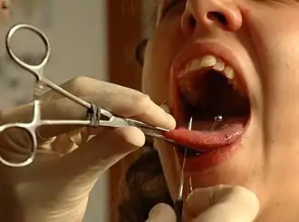 - Monroe-piercing (in de bovenlip, met het ene uiteinde zichtbaar en het andere binnen de mond)