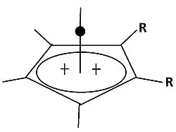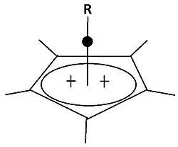 Het ion legt ook een relatie met de organometaalchemie: het kan gezien worden als [22] waarmee de beschrijving wijzigt naar een koolstof C4+ dat gekoppeld is aan een aromatisch η5–pentamethylcyclopentadienyl-systeem, waarmee aan de octetregel voldaan wordt (een zes-elektronendonor in de basis van de piramide en een twee elektronendonor in de methylgroep aan de top van de piramide). Er treedt dan een analogie op met de monomere structuur in de gasfase van de organozink-verbinding , waarin dezelfde liganden gebonden zijn aan zink[II], en daar voldoen aan de 18-elektronenregel voor metaalcomplexen.[23][24]