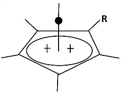 Het ongebruikelijke zit in het feit dat het lijkt alsof koolstof hier zeswaardig is. De valentie van koolstof blijft echter gewoon 4, omdat de bindingen tussen het "gekke" koolstof-atoom en vijf van de zes eraan gebonden koolstof-atomen geen 2-elektron-bindingen zijn. Pedagogisch is het echter een mooi voorbeeld dat er hier wel sprake is van een hyper gecoördineerd, maar niet van een hypervalent atoom.[17] Steven Bachrach heeft dit verschil duidelijk aangetoond en ook de aromaticiteit van het ion verklaard.[18] De beschrijving van binding in deeltjes als het -ion werd al in 1975 geopperd en kort daarna ook spectroscopisch zeer aannemelijk gemaakt.[19][20][21][22]
