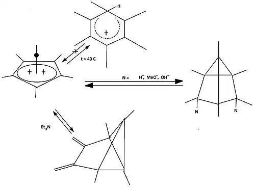 Pogingen om op basis van de synthese van het basision ook uit hexamethylbenzeen het hexamethylderivaat van dikathion te bereiden waren niet succesvol.[14] Een wijzigingen van de door Hogeveen gebruikte benadering werd in 2016 beschreven, in combinatie met een kristallografische karakterisering van . Het piramidale deel van het ion is ongeveer 185 pm hoog en alle methylgroepen aan de basale vijfring zijn iets opgetild ten opzichte van het vlak van de ring, waardoor de koolstofatomen een omgekeerde tetraëdrische geometrie vertonen: alle substituenten liggen aan één zijde van het koolstofatoom. De syntheseroute verliep via de reactie van het mono-epoxide van hexamethyldewarbenzeen met magisch zuur, dat netto een oxide-ion, , onttrekt aan het molecuul en het dikation vormt:[14]