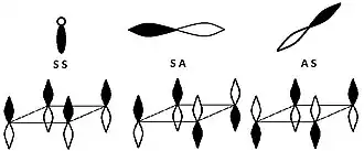 - ↑ a b c d e De S geeft aan dat de orbitaal symmetrisch is ten opzichte van de in het subscript aangegeven vlak. Is de orbitaal antisymmetrisch, dat wil zeggen dat het in het subscript aangegeven vlak een knoopvlak is en het teken van de orbitaal aan weerszijden van dit vlak tegengesteld is, dan wordt een A gebruikt.