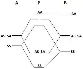 | Figuur 3: Interactie tussen de apicale en basale orbitalen. De "A" bovenaan verwijst naar het apicale koolstofatoom, de "P" naar de piramidale structuur en de "B" naar de basale orbitalen. |