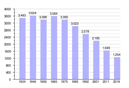 Op 31 december 2019 telde het dorp 1.254 inwoners, een daling vergeleken met het maximum 3.624 personen in 1946.[1]