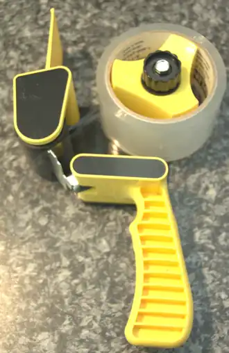De pistoolafroller bestaat uit een houder waarop een rol plakband geschoven kan worden, een handvat en een mechanisme waarmee het plakband op een voorwerp kan worden gedrukt, en waarmee het met een speciale beweging kan worden afgesneden.