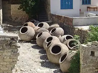 De klei werd samengesteld uit rode en witte klei, gemengd, fijn gestampt en ontdaan van stenen en andere verontreinigingen en met water plastisch gemaakt. Omdat de grote potten op de plaats van bestemming werden gemaakt en gebakken, werd de klei door de toekomstige eigenaar getransporteerd naar de plaats van bestemming. De potten werden vervaardigd door mannen, pitharades (pithari = pot) en de pot werd geheel met de hand gevormd. De pottenmaker begon op dag 1 met het leggen van de bodem, die stevig genoeg moest zijn om het gewicht van de pot te dragen. De dagen erna (gedurende 20 tot 45 dagen, afhankelijk van de afmeting) werd de pot elke dag een stukje verder opgebouwd met een nieuwe ring van klei. Om ervoor te zorgen dat de volgende ring hechtte, werd de gemaakte ring afgedekt om uitdroging te voorkomen. Nadat de pot was voltooid, werd deze 10 tot 15 dagen gedroogd. Daarna werd de pot over matten naar een enorme oven gerold en in drie dagen gebakken; voor de grootste potten werd de oven om de pot heen gemaakt. Na het bakken werden de potten als ze nog warm waren aan de binnenzijde ingesmeerd met teer en azijn om de wanden waterdicht te maken. Op de potten zijn meestal de naam van de maker, de datum en soms de naam van de eigenaar aangebracht.