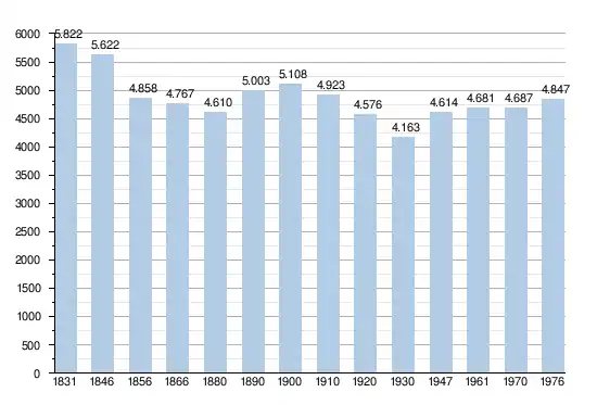 - Bronnen:NIS, Opm:1831 tot en met 1970=volkstellingen; 1976 = inwoneraantal op 31 december