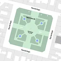 Het centrale deel van het plein is ingericht als een 12.370 m² groot park, Square Louis XIII genoemd. De oorspronkelijke tuinaanleg in Franse stijl dateert uit 1682. In 1976 werd het park opnieuw ingericht, waarbij onder andere de bomen werden vervangen. Aan de randen van het plein staat thans een driedubbele rij Krimlindebomen en in het midden een cirkelvormige bomengroep met paardenkastanjes rond het beeld van Lodewijk XIII.