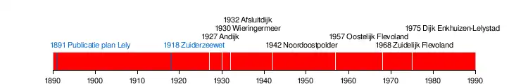 | Oostelijk Flevoland | Oostelijk Flevolanddijk, Knardijk etc. | 90 km | Begin 1950 | 13 september 1956 | 54 000 ha | 29 juni 1957 |