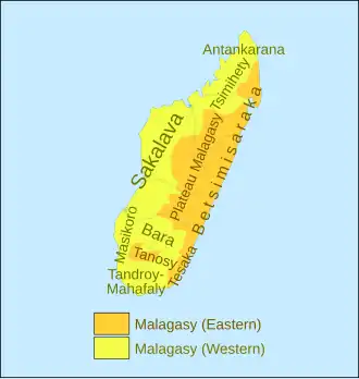 - ↑ Als je de verticaal lopende oostgrens van het Plateaumalagasi-taalgebied in een noordelijk en een zuidelijk gebied zou indelen, wordt de taal in de noordelijke helft door het Noordelijk Betsimisaraka-Malagasi begrensd.
