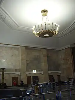 De oostelijke eindwand van de middenhal was oorspronkelijk versierd met bas-reliëf van "Stalin en Lenin". Stalin werd afgebeeld met in zijn hand de Grondwet van de Sovjet-Unie.[8] In 1947 werd het bas-reliëf verwijderd om de bouw van de roltrap naar het oostelijke toegangsgebouw mogelijk te maken. Het bas-reliëf werd verplaatst naar de eindwand in station Paveletskaja van de ringlijn.[29] In de jaren 60 werd het reliëf ook daar verwijderd in het kader van de destalinisatie.[30]
