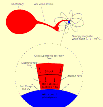 Een van de belangrijkste consequenties van de aanwezigheid van een sterk magnetisch veld in de witte dwerg in een polar is, dat daardoor de rotatieperiode gesynchroniseerd wordt met de omlooptijd van de begeleider, wat betekent dat dezelfde kant van de witte dwerg altijd naar de kant van de begeleider staat (net als bij de aarde en de maan, waarbij de achterkant van de maan nooit zichtbaar is vanaf de aarde). Deze synchrone rotatie is een definiërend aspect van een polar. Wat ook van groot belang is, is dat de accretiestroom van de donorster afgevangen wordt door het magnetisch veld van de witte dwerg, zodat er geen accretieschijf kan worden gevormd. Dit afvangen wordt in het Engels 'threading' genoemd, en het vindt plaats waar de magnetische druk van de witte dwerg gelijk is aan de ram pressure. Het afgevangen materiaal vloeit via de magnetische veldlijnen totdat het neerstort op een (of beide) magnetische polen van de witte dwerg. Dit wrijvingspunt op het steroppervlak is slechts een fractie van het totale oppervlak, maar kan verantwoordelijk zijn voor de helft van de luminositeit van de dubbelster. Behalve de optische en nabij-infrarode cyclotronstraling, produceert deze plek van impact ook röntgenstraling vanwege de hoge gastemperatuur in het botsingsgebied. Polars zijn dus vaak een stuk helderder in röntgenstraling dan niet-magnetische cataclysmische variabelen.