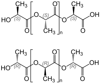Men kan zowel d- als l-melkzuur of een mengsel van beide gebruiken. De graad van kristalliniteit van het polymeer hangt af van de verhouding tussen d- en l-melkzuur. Poly-l-melkzuur is het meest kristallijn en heeft de beste thermische stabiliteit; maar bij hogere temperatuur heeft polymelkzuur de neiging te racemiseren tot poly-d/l-melkzuur, zodat het meer amorf wordt en de thermische stabiliteit afneemt. Poly(tetramethylglycolide) (PTMG), een ander biosynthetisch polymeer op basis van melkzuur maar dat niet racemiseerbaar is, zou deze nadelen niet hebben en een hogere thermische stabiliteit hebben dan polymelkzuur.[1]