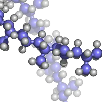 Molecuulmodel van een lineair polymeer, in dit geval polypropyleen.