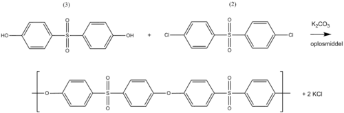 Hier gebeurt de vorming van het dikaliumzout niet in een afzonderlijke stap zoals bij polysulfon, maar gebeurt de polymerisatie in één stap.