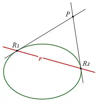 Ligt binnen de ellips, dan is – in dit geval per definitie – de lijn ook de poollijn van .