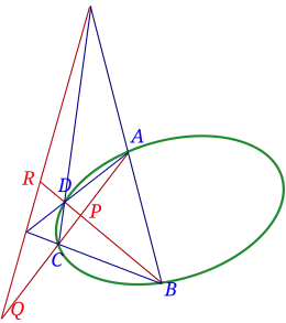 De diagonaaldriehoek PQR van de volledige vierhoek ABCD is een pooldriehoek van de ellips.