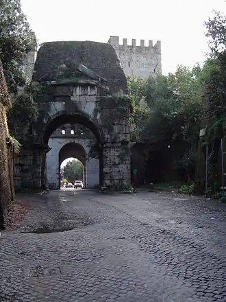 Keizer Honorius liet in 401 grote verbeteringen in de Aureliaanse Muur aanbrengen. De muur werd verhoogd tot elf meter en de poorten verstevigd. Hierbij werd de dubbele doorgang teruggebracht tot een enkele. Deze werd bekleed met travertijn en marmer (afkomstig van de vele grafmonumenten langs de Via Appia), om de bakstenen constructie te verstevigen. Het onderste deel van de ronde torens werd ingebouwd in vierkante bastions. Op de torens werden katapulten opgesteld.