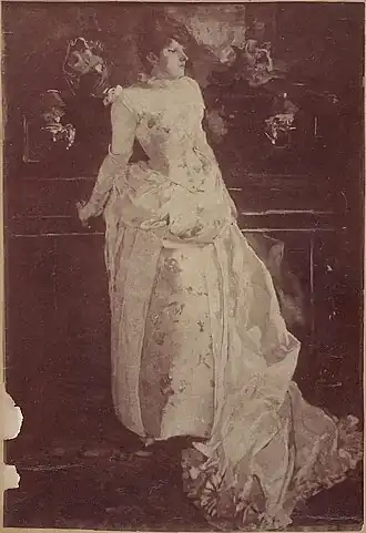 Breitner portretteert Theo Bouwmeester in haar rol van de trotse Francine Riverolles in de eerste akte van Francillon, een toneelstuk van Alexandre Dumas fils. Hij schildert haar ten voeten uit, meer dan levensgroot, met een zweem van nonchalance en brutaliteit, het hoofd naar rechts gewend en de handen steunend op een achter haar geposteerde piano. Haar witgele avondjurk contrasteert sterk met de glanzend zwarte piano. Haar sleep waaiert uit over een roodbruin tapijt.
