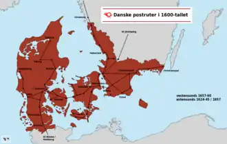 Door het bevel van de Deense koning Christiaan IV op 24 december 1624 werd in Denemarken een postdienst opgericht, die in 1653 overigens werd uitgebreid tot in Noorwegen. Deze postdienst bestond uit negen hoofdroutes en werd aangestuurd vanuit Kopenhagen. Postzegels werden hier nog niet gebruikt, deze zouden pas worden ingezet vanaf de 19de eeuw.