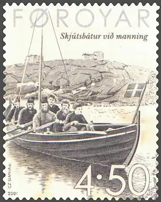 Tijdens de jaren 1860 werd op de Faeröer een postdienst op poten gezet, het Skjúts-systeem. In 1865 werd het Skjúts-systeem gereguleerd, nadat de Løgting, het wetgevend orgaan van de Faeröer, een wet hieromtrent had aangenomen. In de Faeröerse dorpen werd een Skjútsskaffari aangesteld, een soort postmeester of postbode, die de taak had om personen, brieven en pakketjes per boot te vervoeren tussen de verschillende eilanden van de Faeröer.