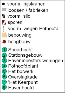 Op het Pothoofd zijn nog diverse zaken terug te vinden uit de tijd van overslag en industrie. Hieronder wordt een opsomming gegeven van de belangrijkste 'relicten'. De nummers verwijzen naar de locatie op het kaartje en foto's van Het Pothoofd anno 2007.