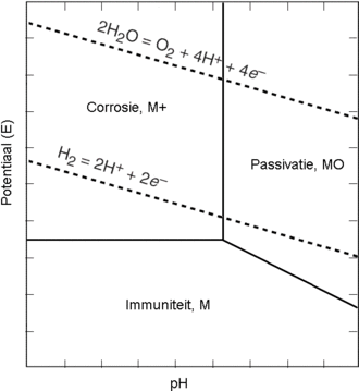 - Immune gebied; het metaal reageert überhaupt niet, en blijft in ongewijzigde vorm bestaan (M)