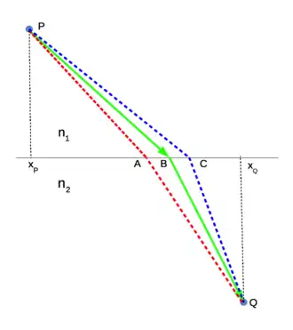 - De weg die een lichtstraal tussen twee punten aflegt, is die welke in de kortste tijd afgelegd wordt.
