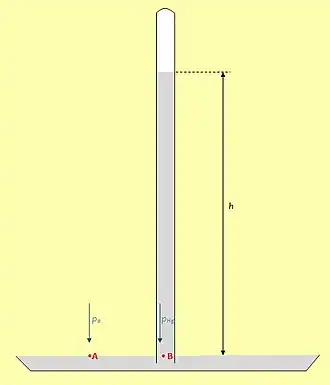 Verwijzend naar de figuur rechts, betekent dit dat de luchtdruk, uitgeoefend op het punt A (p0), gelijk moet zijn aan de hydrostatische druk door de kwikkolom uitgeoefend in punt B (pHg).