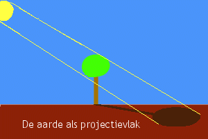 Als de stralen evenwijdig zijn, zoals bij zonlicht, want de zon staat zeer ver weg, en loodrecht op het onderwerp en het projectiedoek vallen, is de projectie even groot als het onderwerp. Als het projectievlak scheef staat wordt de projectie groter dan het onderwerp. Zo zijn er bij een laag staande zon altijd lange schaduwen van bomen en gebouwen, met de grond als het projectievlak.