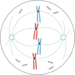 Microtubuli afkomstig uit centrosomen (de polen van het spoelfiguur), bereiken de chromosomen en hechten zich aan de kinetochoren, waardoor de chromosomen in beweging worden gebracht. Het spoelfiguur ontwikkelt zich verder; sommige microtubuli maken contact met microtubuli van de tegenovergestelde pool. Vervolgens worden er krachten uitgeoefend door motoreiwitten, waardoor de chromosomen naar het equatorvlak (midden van de cel) bewegen.[1]