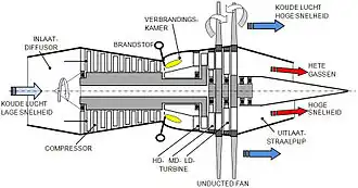 De propfan kan op verschillende manieren uitgevoerd worden. De illustratie toont een motor met een axiale compressor, een verbrandingskamer en drie turbinetrappen, genaamd hogedruk-, middeldruk- en lagedrukturbine. De HD-turbine drijft de compressor aan, de MD-turbine is direct gekoppeld met de eerste trap van de fan, en de LD-turbine is gekoppeld met de tweede trap van de fan. De fans bevinden zich aan de buitenkant van het turbinehuis.