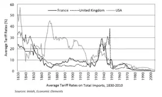 Aan het begin van de 19e eeuw bedroeg het gemiddelde tarief op ingevoerde industrieproducten ongeveer 50%, het hoogste van alle grote Europese landen. Ondanks zijn groeiende technologische voorsprong op andere naties bleef het Verenigd Koninkrijk zijn beleid van industriële bevordering voortzetten tot het midden van de 19e eeuw en handhaafde het zeer hoge tarieven op ingevoerde industrieproducten tot in de jaren 1820, twee generaties na het begin van de Industriële Revolutie. Zo werd volgens de economisch historicus Paul Bairoch de technologische vooruitgang van het Verenigd Koninkrijk bereikt "achter hoge en blijvende tarifaire belemmeringen". In 1846 was de industrialisatiegraad per hoofd van de bevolking meer dan het dubbele van die van de naaste concurrenten.[51]