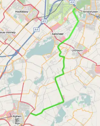 De weg is uitgevoerd als tweestrooks-gebiedsontsluitingsweg met buiten de bebouwde kom een maximumsnelheid van 80 km/h, met uitzondering van de Legmeerdijk tussen Amstelveen en Flora Holland waar een 60 km/h zone geldt. In de gemeente Alphen aan den Rijn draagt de weg de straatnaamNieuwkoopseweg. In de gemeente Nieuwkoop heet de weg eveneens Nieuwkoopseweg en daarnaast Nieuwveenseweg, Schoterweg, Oost Provinciale weg, Achterweg en Vrouwenakker (naar de gelijknamige buurtschap). In de gemeente Uithoorn heet de weg Noord-Zuidroute en Legmeerdijk. Tussen Aalsmeer en Schiphol-Oost draagt de weg de namen Legmeerdijk, Bosrandweg met de Bosrandbrug en Schipholdijk, dit gedeelte verloopt eerst op de gemeentegrens tussen de gemeenten Uithoorn en Aalsmeer en vervolgens op de gemeentegrens tussen Aalsmeer en Amstelveen.