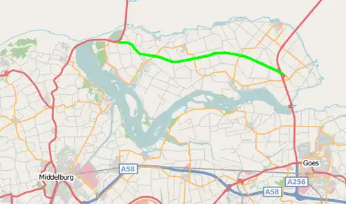 De weg is uitgevoerd als tweestrooks-stroomweg met een maximumsnelheid van 100 km/h (autoweg). De weg draagt over de gehele lengte de naam Oost-Westweg. De weg is een belangrijke toevoerroute voor verkeer vanaf Goes richting het Deltapark Neeltje Jans op het gelijknamige werkeiland.