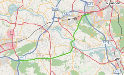 In Wijchen sluit de weg aan op de oude Nijmeegse Graafseweg en loopt in Nijmegen naar het Takenhofplein waar de weg aansluit op de Provinciale weg 326.