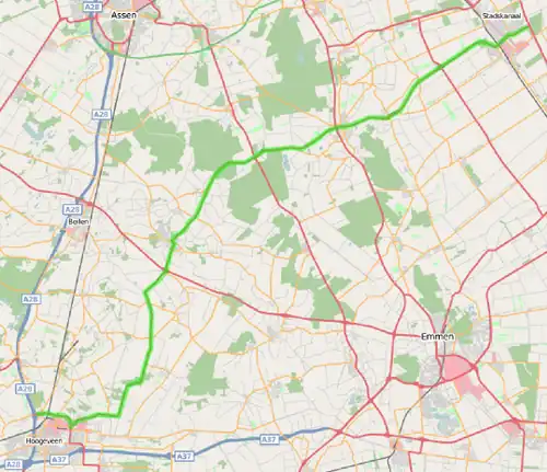 De weg was tot 2009 tussen Nieuw-Buinen en Buinen uitgevoerd als tweestrooks-autoweg met een maximumsnelheid van 100 km/h. Tegenwoordig is de hele weg uitgevoerd als gebiedsontsluitingsweg met een maximumsnelheid van 80 km/h.